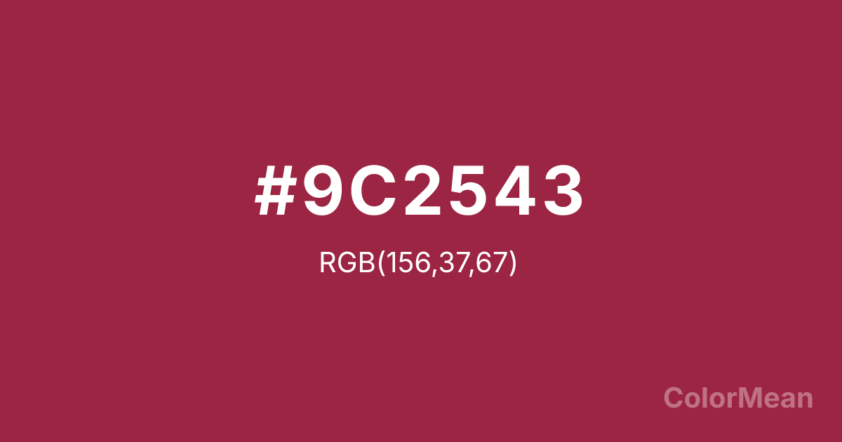 #9C2543 RGB value is (156, 37, 67). The hex color red value is 156, green is 37, and blue is 67. Its HSL format shows a hue of 345°, saturation of 62 percent, and lightness of 38 percent. The CMYK process values are 0 percent, 76 percent, 57 percent, 39 percent.
