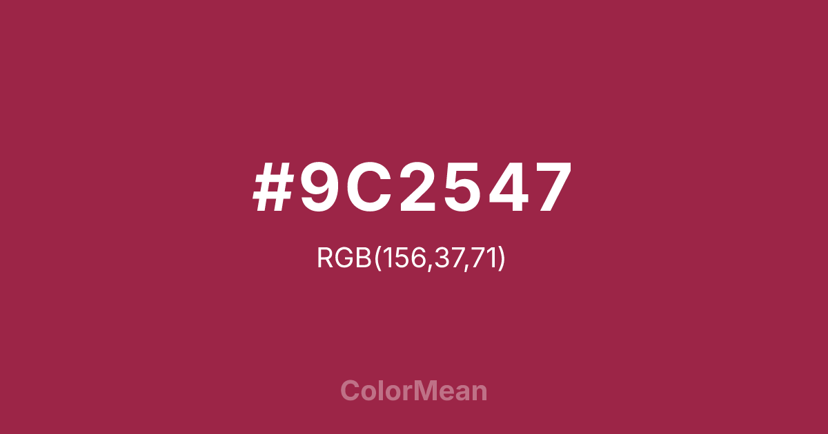 #9C2547 RGB value is (156, 37, 71). The hex color red value is 156, green is 37, and blue is 71. Its HSL format shows a hue of 343°, saturation of 62 percent, and lightness of 38 percent. The CMYK process values are 0 percent, 76 percent, 54 percent, 39 percent.