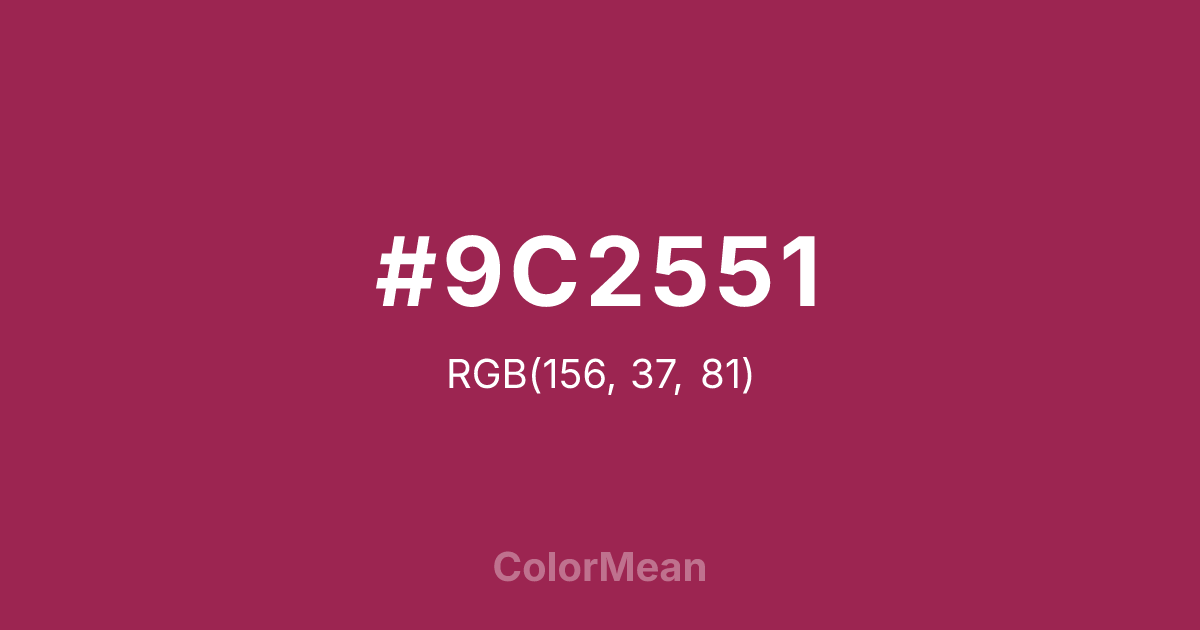 #9C2551 RGB value is (156, 37, 81). The hex color red value is 156, green is 37, and blue is 81. Its HSL format shows a hue of 338°, saturation of 62 percent, and lightness of 38 percent. The CMYK process values are 0 percent, 76 percent, 48 percent, 39 percent.