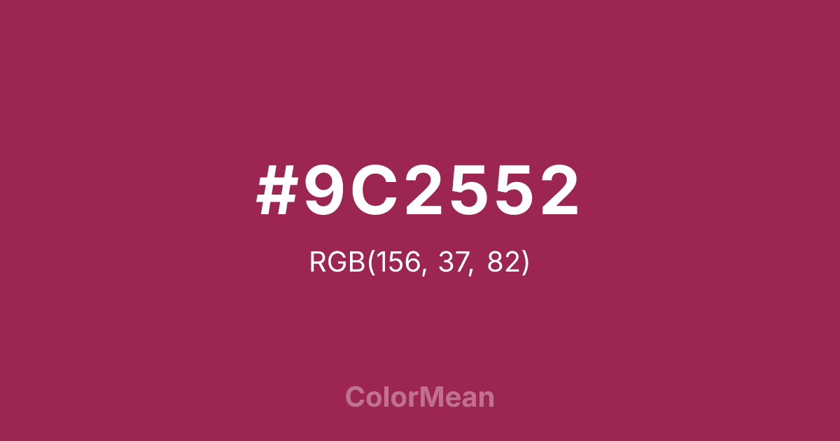 #9C2552 RGB value is (156, 37, 82). The hex color red value is 156, green is 37, and blue is 82. Its HSL format shows a hue of 337°, saturation of 62 percent, and lightness of 38 percent. The CMYK process values are 0 percent, 76 percent, 47 percent, 39 percent.