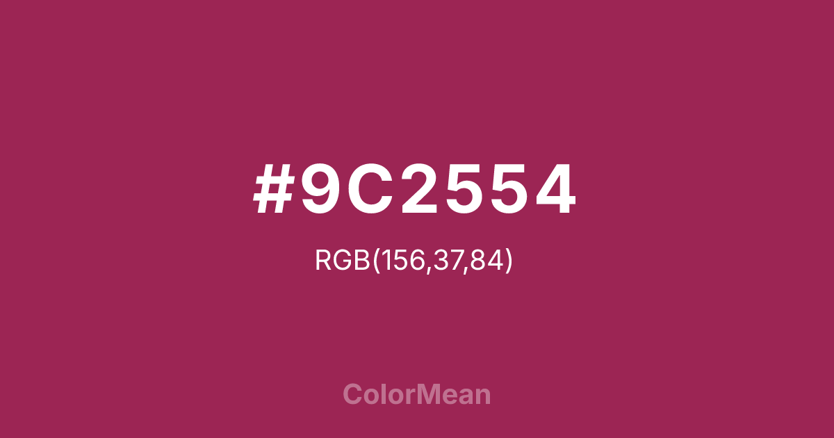 #9C2554 RGB value is (156, 37, 84). The hex color red value is 156, green is 37, and blue is 84. Its HSL format shows a hue of 336°, saturation of 62 percent, and lightness of 38 percent. The CMYK process values are 0 percent, 76 percent, 46 percent, 39 percent.