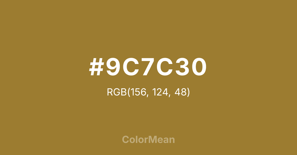 #9C7C30 RGB value is (156, 124, 48). The hex color red value is 156, green is 124, and blue is 48. Its HSL format shows a hue of 42°, saturation of 53 percent, and lightness of 40 percent. The CMYK process values are 0 percent, 21 percent, 69 percent, 39 percent.