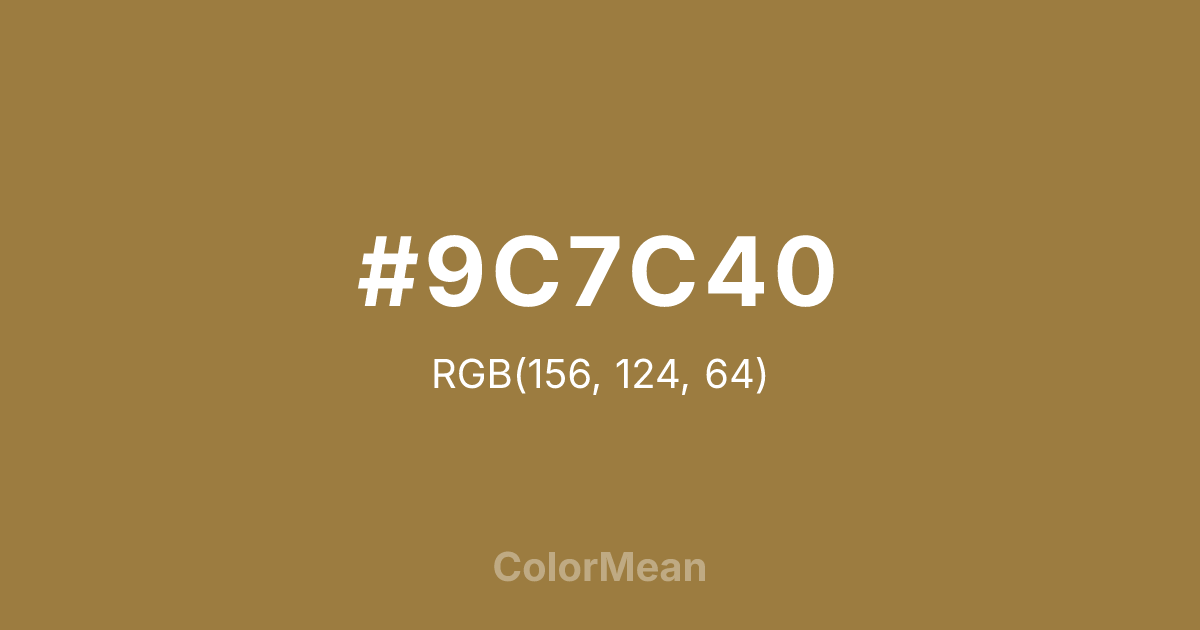 #9C7C40 RGB value is (156, 124, 64). The hex color red value is 156, green is 124, and blue is 64. Its HSL format shows a hue of 39°, saturation of 42 percent, and lightness of 43 percent. The CMYK process values are 0 percent, 21 percent, 59 percent, 39 percent.