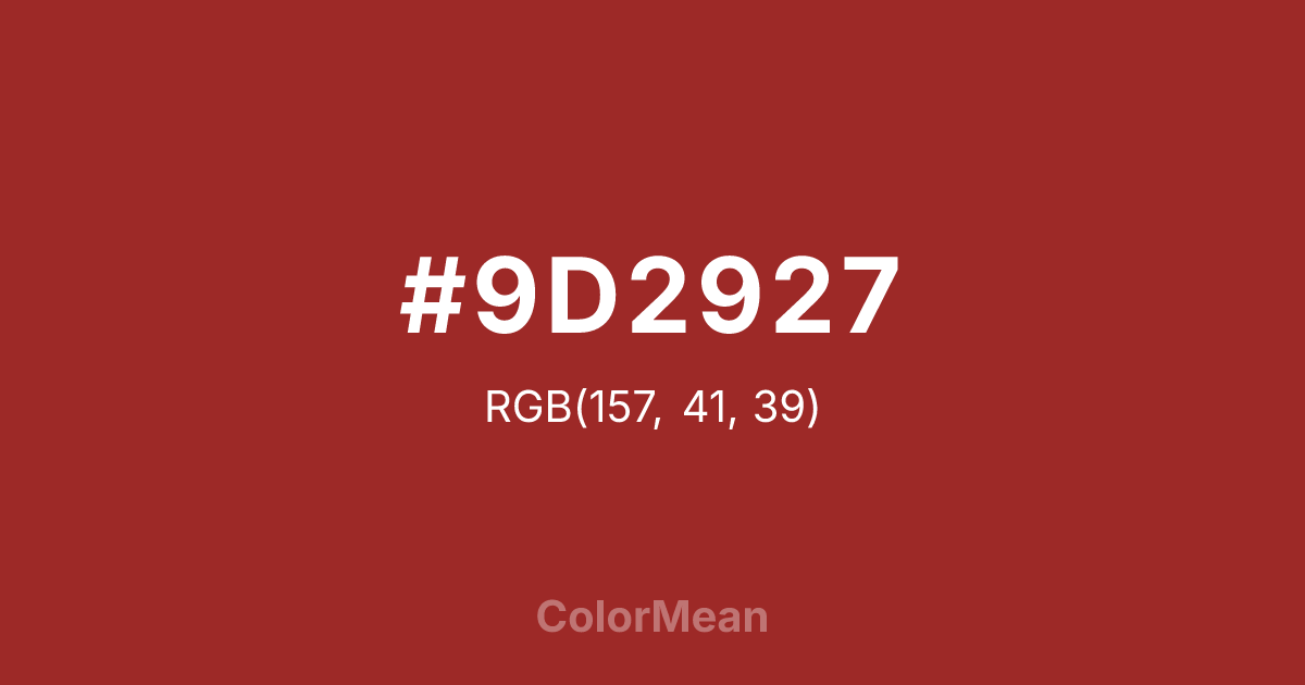 #9D2927 RGB value is (157, 41, 39). The hex color red value is 157, green is 41, and blue is 39. Its HSL format shows a hue of 1°, saturation of 60 percent, and lightness of 38 percent. The CMYK process values are 0 percent, 74 percent, 75 percent, 38 percent.