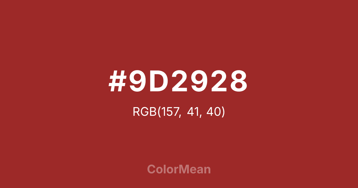 #9D2928 RGB value is (157, 41, 40). The hex color red value is 157, green is 41, and blue is 40. Its HSL format shows a hue of 1°, saturation of 59 percent, and lightness of 39 percent. The CMYK process values are 0 percent, 74 percent, 75 percent, 38 percent.