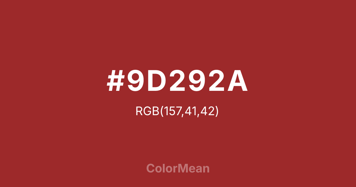 #9D292A RGB value is (157, 41, 42). The hex color red value is 157, green is 41, and blue is 42. Its HSL format shows a hue of 359°, saturation of 59 percent, and lightness of 39 percent. The CMYK process values are 0 percent, 74 percent, 73 percent, 38 percent.