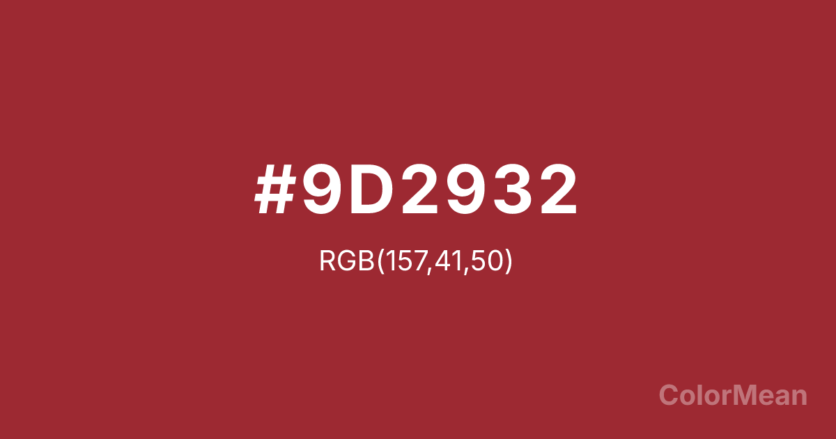 #9D2932 RGB value is (157, 41, 50). The hex color red value is 157, green is 41, and blue is 50. Its HSL format shows a hue of 355°, saturation of 59 percent, and lightness of 39 percent. The CMYK process values are 0 percent, 74 percent, 68 percent, 38 percent.