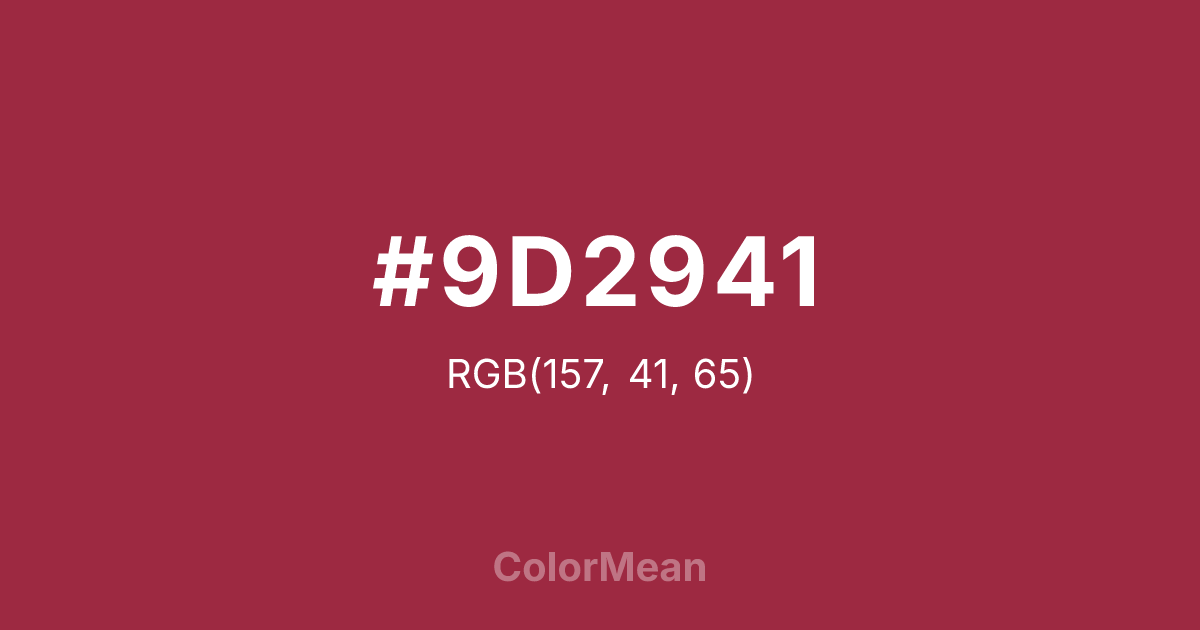 #9D2941 RGB value is (157, 41, 65). The hex color red value is 157, green is 41, and blue is 65. Its HSL format shows a hue of 348°, saturation of 59 percent, and lightness of 39 percent. The CMYK process values are 0 percent, 74 percent, 59 percent, 38 percent.