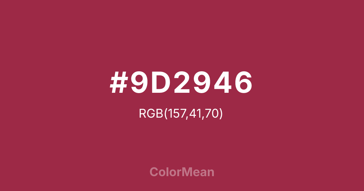 #9D2946 RGB value is (157, 41, 70). The hex color red value is 157, green is 41, and blue is 70. Its HSL format shows a hue of 345°, saturation of 59 percent, and lightness of 39 percent. The CMYK process values are 0 percent, 74 percent, 55 percent, 38 percent.