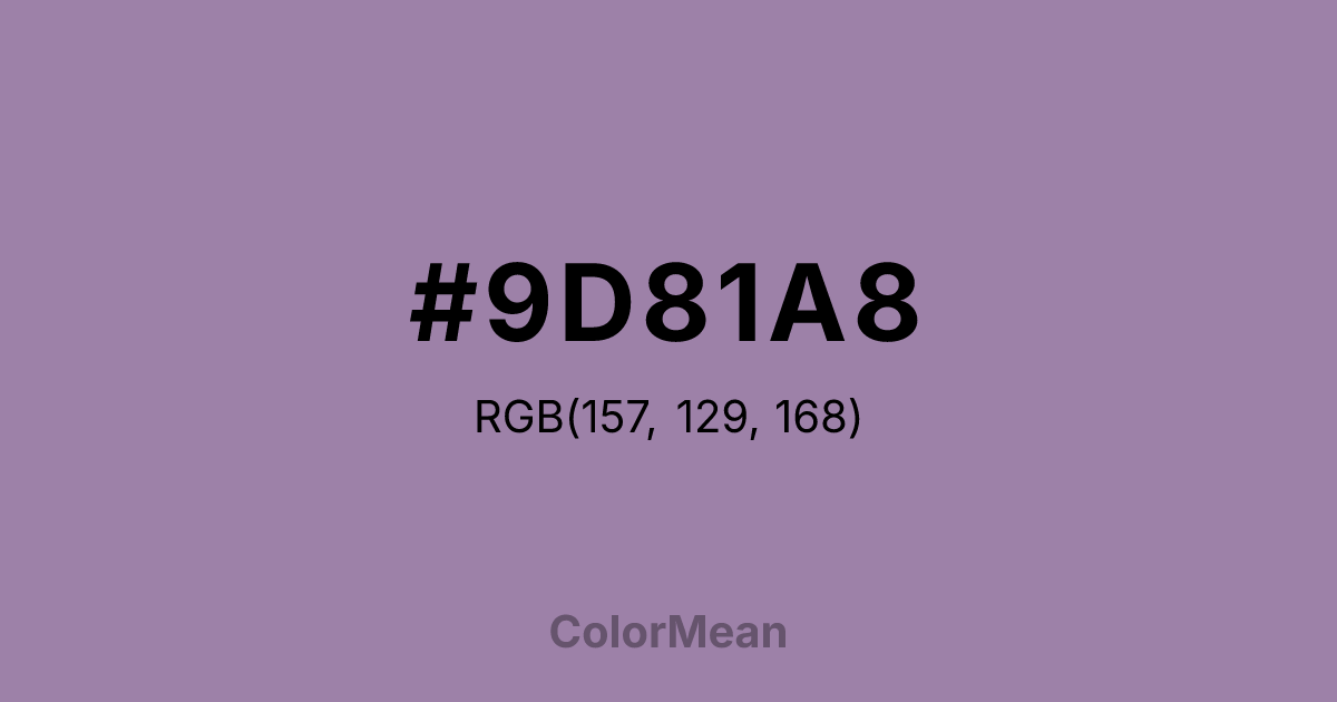 #9D81A8 RGB value is (157, 129, 168). The hex color red value is 157, green is 129, and blue is 168. Its HSL format shows a hue of 283°, saturation of 18 percent, and lightness of 58 percent. The CMYK process values are 7 percent, 23 percent, 0 percent, 34 percent.
