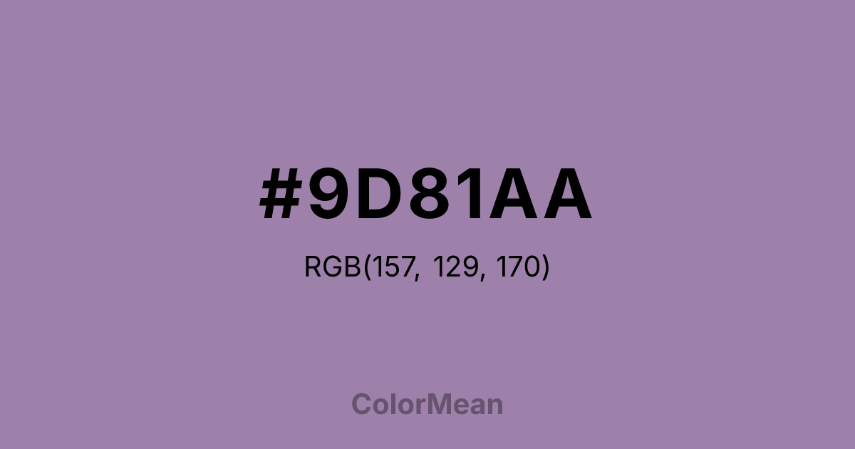#9D81AA RGB value is (157, 129, 170). The hex color red value is 157, green is 129, and blue is 170. Its HSL format shows a hue of 281°, saturation of 19 percent, and lightness of 59 percent. The CMYK process values are 8 percent, 24 percent, 0 percent, 33 percent.