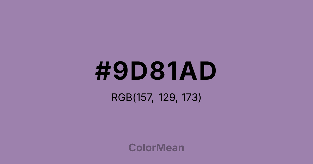 #9D81AD RGB value is (157, 129, 173). The hex color red value is 157, green is 129, and blue is 173. Its HSL format shows a hue of 278°, saturation of 21 percent, and lightness of 59 percent. The CMYK process values are 9 percent, 25 percent, 0 percent, 32 percent.