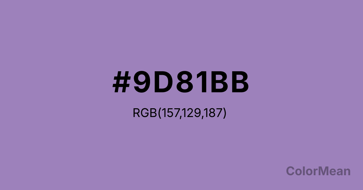 #9D81BB RGB value is (157, 129, 187). The hex color red value is 157, green is 129, and blue is 187. Its HSL format shows a hue of 269°, saturation of 30 percent, and lightness of 62 percent. The CMYK process values are 16 percent, 31 percent, 0 percent, 27 percent.