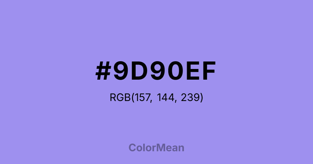 #9D90EF RGB value is (157, 144, 239). The hex color red value is 157, green is 144, and blue is 239. Its HSL format shows a hue of 248°, saturation of 75 percent, and lightness of 75 percent. The CMYK process values are 34 percent, 40 percent, 0 percent, 6 percent.