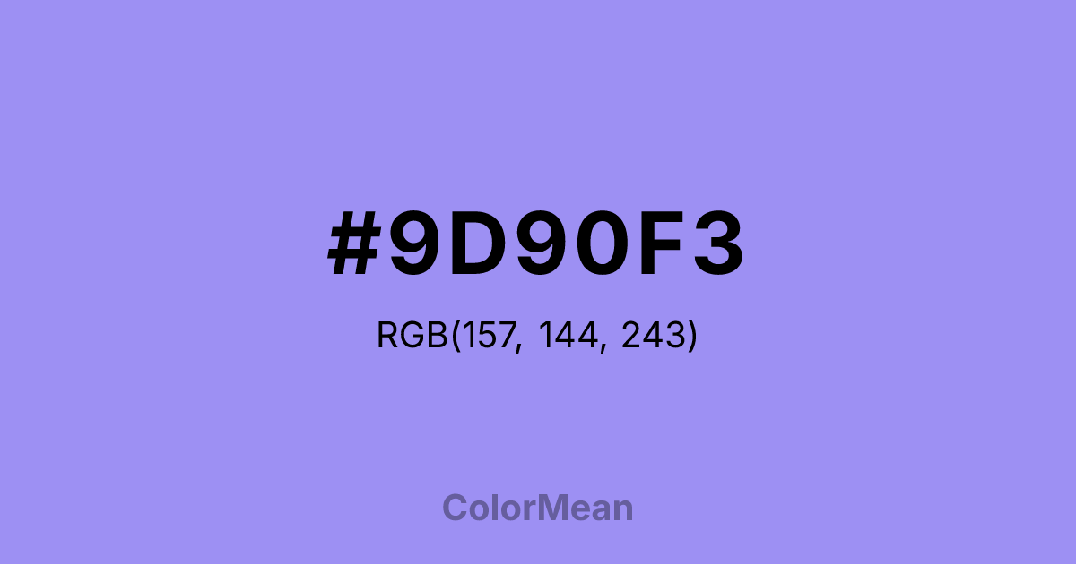 #9D90F3 RGB value is (157, 144, 243). The hex color red value is 157, green is 144, and blue is 243. Its HSL format shows a hue of 248°, saturation of 80 percent, and lightness of 76 percent. The CMYK process values are 35 percent, 41 percent, 0 percent, 5 percent.
