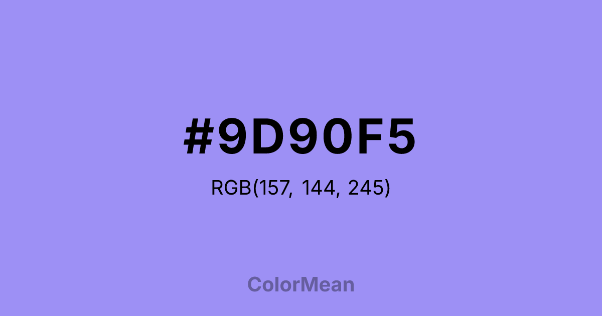 #9D90F5 RGB value is (157, 144, 245). The hex color red value is 157, green is 144, and blue is 245. Its HSL format shows a hue of 248°, saturation of 83 percent, and lightness of 76 percent. The CMYK process values are 36 percent, 41 percent, 0 percent, 4 percent.