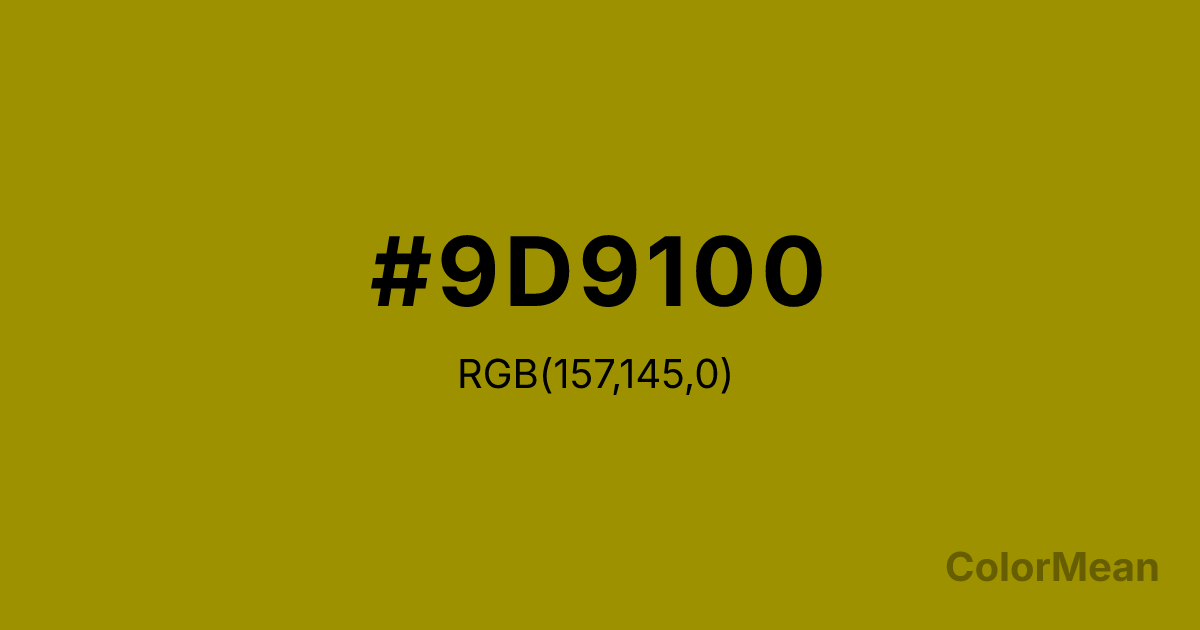 #9D9100 RGB value is (157, 145, 0). The hex color red value is 157, green is 145, and blue is 0. Its HSL format shows a hue of 55°, saturation of 100 percent, and lightness of 31 percent. The CMYK process values are 0 percent, 8 percent, 100 percent, 38 percent.