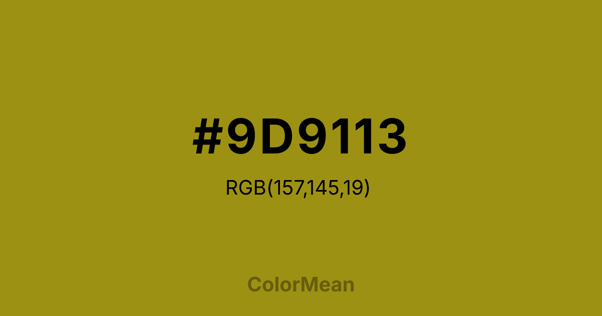 #9D9113 RGB value is (157, 145, 19). The hex color red value is 157, green is 145, and blue is 19. Its HSL format shows a hue of 55°, saturation of 78 percent, and lightness of 35 percent. The CMYK process values are 0 percent, 8 percent, 88 percent, 38 percent.