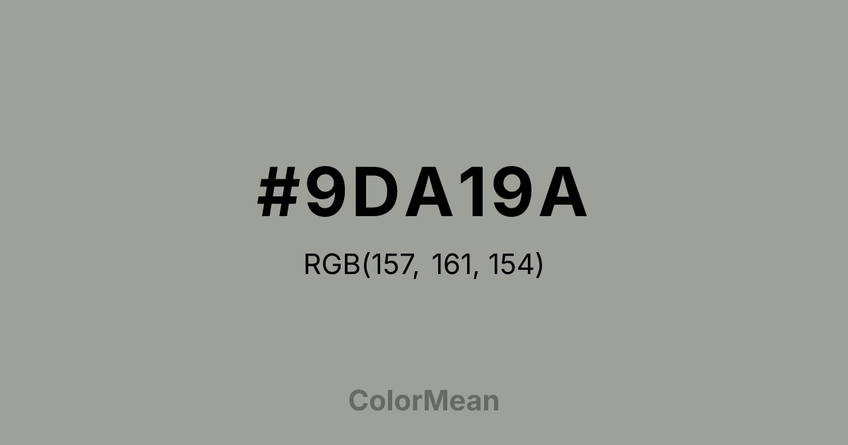 #9DA19A RGB value is (157, 161, 154). The hex color red value is 157, green is 161, and blue is 154. Its HSL format shows a hue of 94°, saturation of 4 percent, and lightness of 62 percent. The CMYK process values are 2 percent, 0 percent, 4 percent, 37 percent.