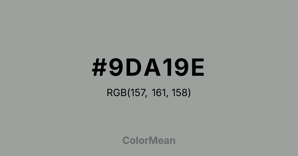 #9DA19E RGB value is (157, 161, 158). The hex color red value is 157, green is 161, and blue is 158. Its HSL format shows a hue of 135°, saturation of 2 percent, and lightness of 62 percent. The CMYK process values are 2 percent, 0 percent, 2 percent, 37 percent.