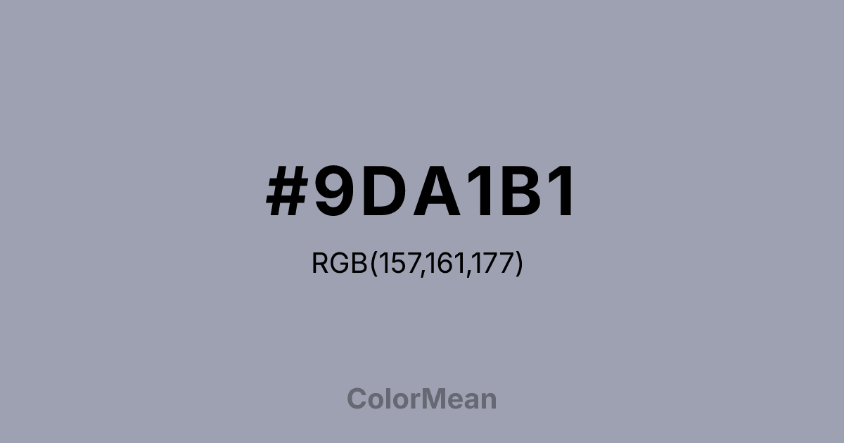 #9DA1B1 RGB value is (157, 161, 177). The hex color red value is 157, green is 161, and blue is 177. Its HSL format shows a hue of 228°, saturation of 11 percent, and lightness of 65 percent. The CMYK process values are 11 percent, 9 percent, 0 percent, 31 percent.