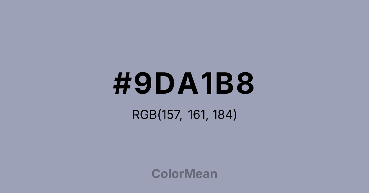 #9DA1B8 RGB value is (157, 161, 184). The hex color red value is 157, green is 161, and blue is 184. Its HSL format shows a hue of 231°, saturation of 16 percent, and lightness of 67 percent. The CMYK process values are 15 percent, 13 percent, 0 percent, 28 percent.
