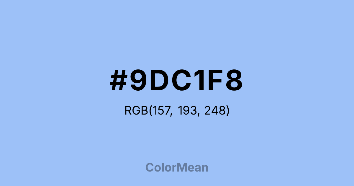 #9DC1F8 RGB value is (157, 193, 248). The hex color red value is 157, green is 193, and blue is 248. Its HSL format shows a hue of 216°, saturation of 87 percent, and lightness of 79 percent. The CMYK process values are 37 percent, 22 percent, 0 percent, 3 percent.