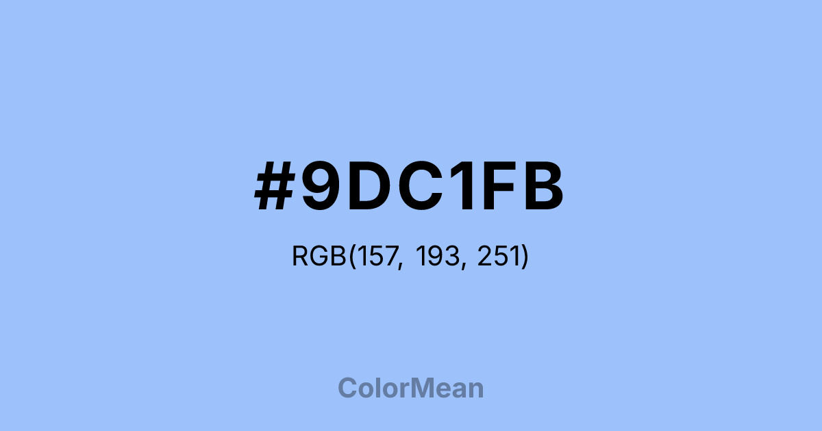 #9DC1FB RGB value is (157, 193, 251). The hex color red value is 157, green is 193, and blue is 251. Its HSL format shows a hue of 217°, saturation of 92 percent, and lightness of 80 percent. The CMYK process values are 37 percent, 23 percent, 0 percent, 2 percent.