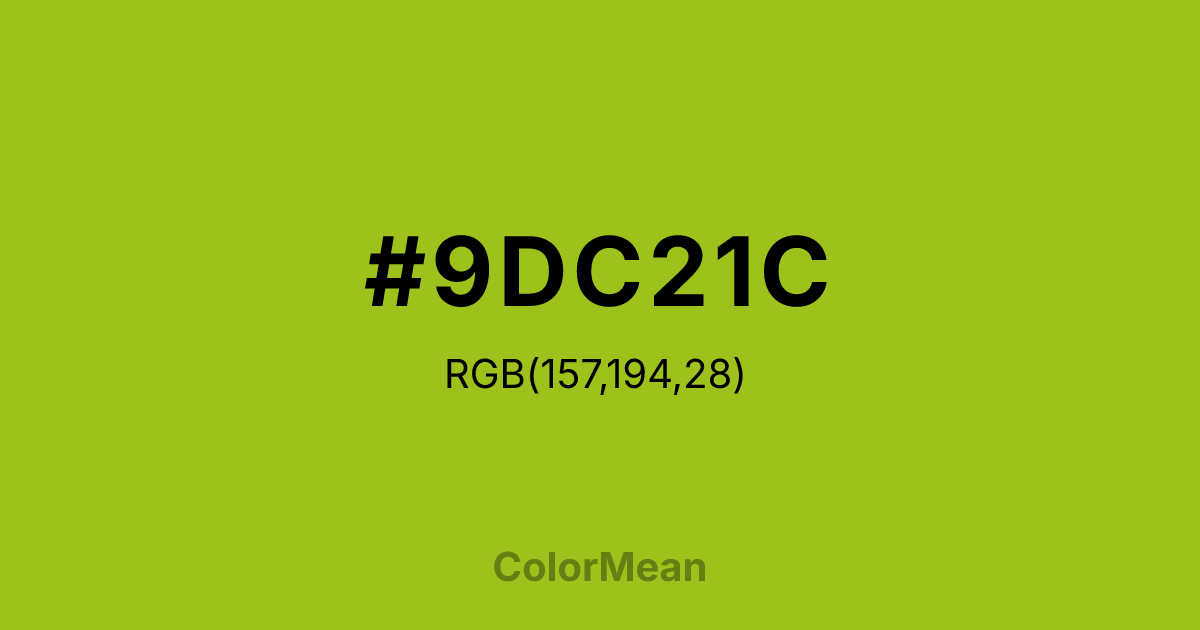 #9DC21C RGB value is (157, 194, 28). The hex color red value is 157, green is 194, and blue is 28. Its HSL format shows a hue of 73°, saturation of 75 percent, and lightness of 44 percent. The CMYK process values are 19 percent, 0 percent, 86 percent, 24 percent.