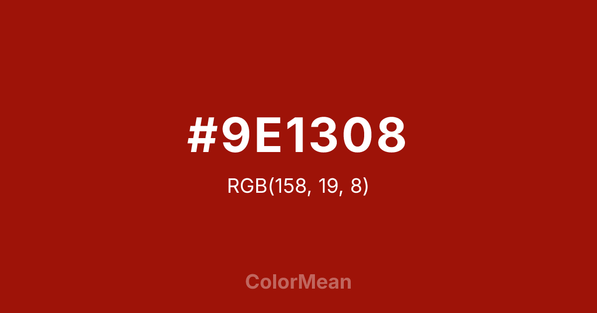 #9E1308 RGB value is (158, 19, 8). The hex color red value is 158, green is 19, and blue is 8. Its HSL format shows a hue of 4°, saturation of 90 percent, and lightness of 33 percent. The CMYK process values are 0 percent, 88 percent, 95 percent, 38 percent.