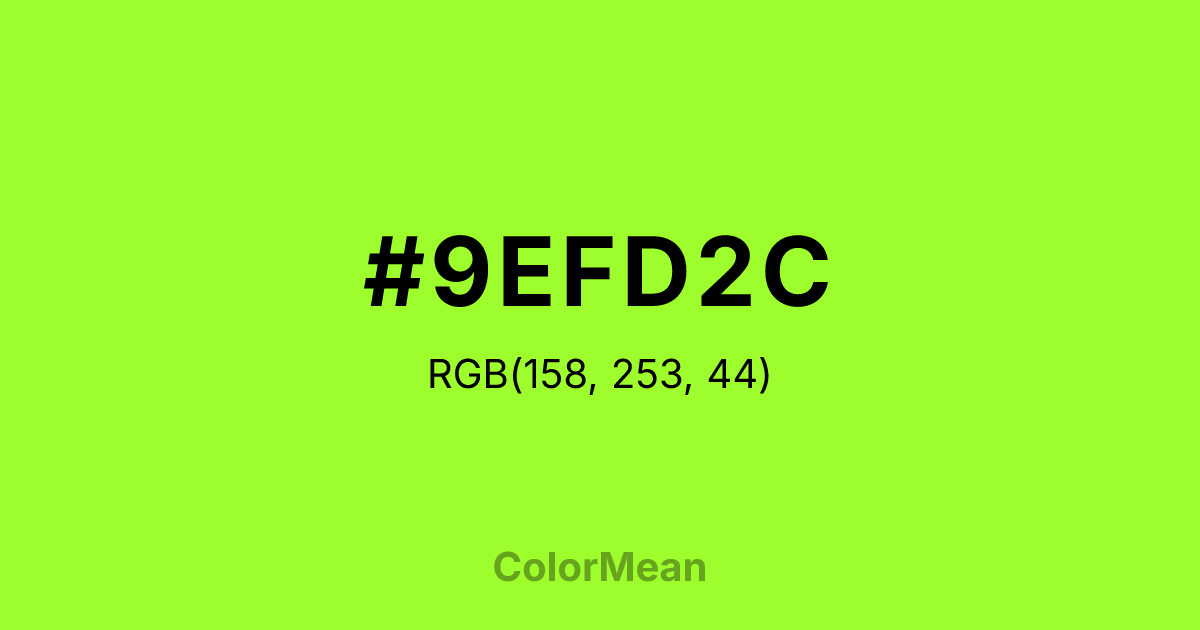 #9EFD2C RGB value is (158, 253, 44). The hex color red value is 158, green is 253, and blue is 44. Its HSL format shows a hue of 87°, saturation of 98 percent, and lightness of 58 percent. The CMYK process values are 38 percent, 0 percent, 83 percent, 1 percent.