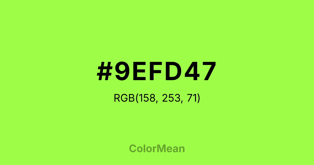 #9EFD47 RGB value is (158, 253, 71). The hex color red value is 158, green is 253, and blue is 71. Its HSL format shows a hue of 91°, saturation of 98 percent, and lightness of 64 percent. The CMYK process values are 38 percent, 0 percent, 72 percent, 1 percent.