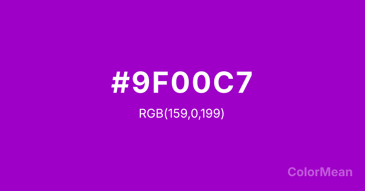 #9F00C7 RGB value is (159, 0, 199). The hex color red value is 159, green is 0, and blue is 199. Its HSL format shows a hue of 288°, saturation of 100 percent, and lightness of 39 percent. The CMYK process values are 20 percent, 100 percent, 0 percent, 22 percent.