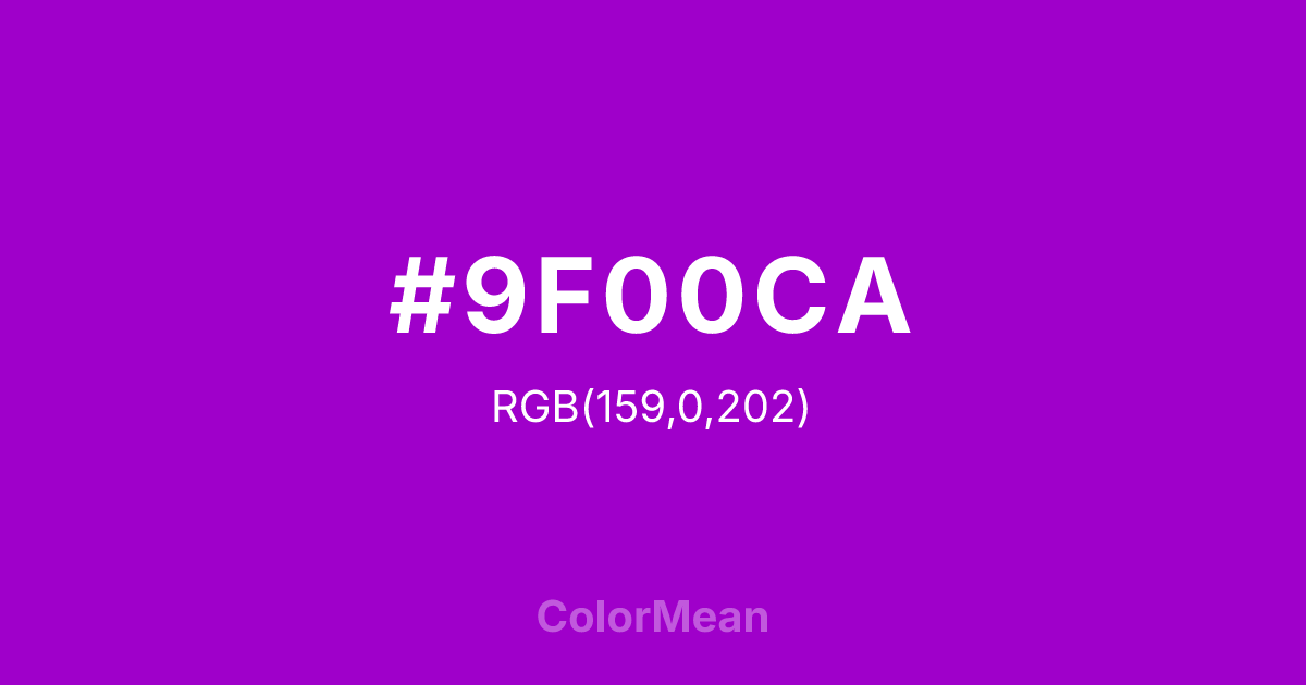 #9F00CA RGB value is (159, 0, 202). The hex color red value is 159, green is 0, and blue is 202. Its HSL format shows a hue of 287°, saturation of 100 percent, and lightness of 40 percent. The CMYK process values are 21 percent, 100 percent, 0 percent, 21 percent.