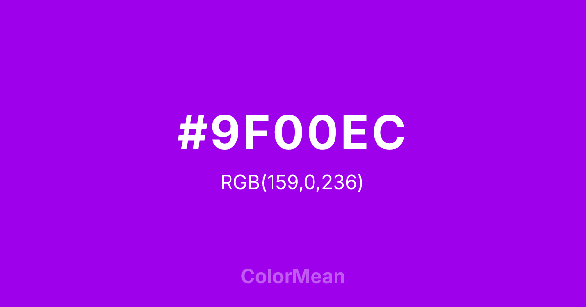 #9F00EC RGB value is (159, 0, 236). The hex color red value is 159, green is 0, and blue is 236. Its HSL format shows a hue of 280°, saturation of 100 percent, and lightness of 46 percent. The CMYK process values are 33 percent, 100 percent, 0 percent, 7 percent.