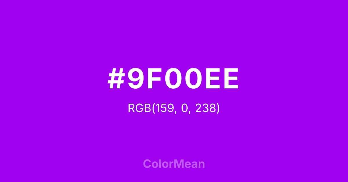 #9F00EE RGB value is (159, 0, 238). The hex color red value is 159, green is 0, and blue is 238. Its HSL format shows a hue of 280°, saturation of 100 percent, and lightness of 47 percent. The CMYK process values are 33 percent, 100 percent, 0 percent, 7 percent.
