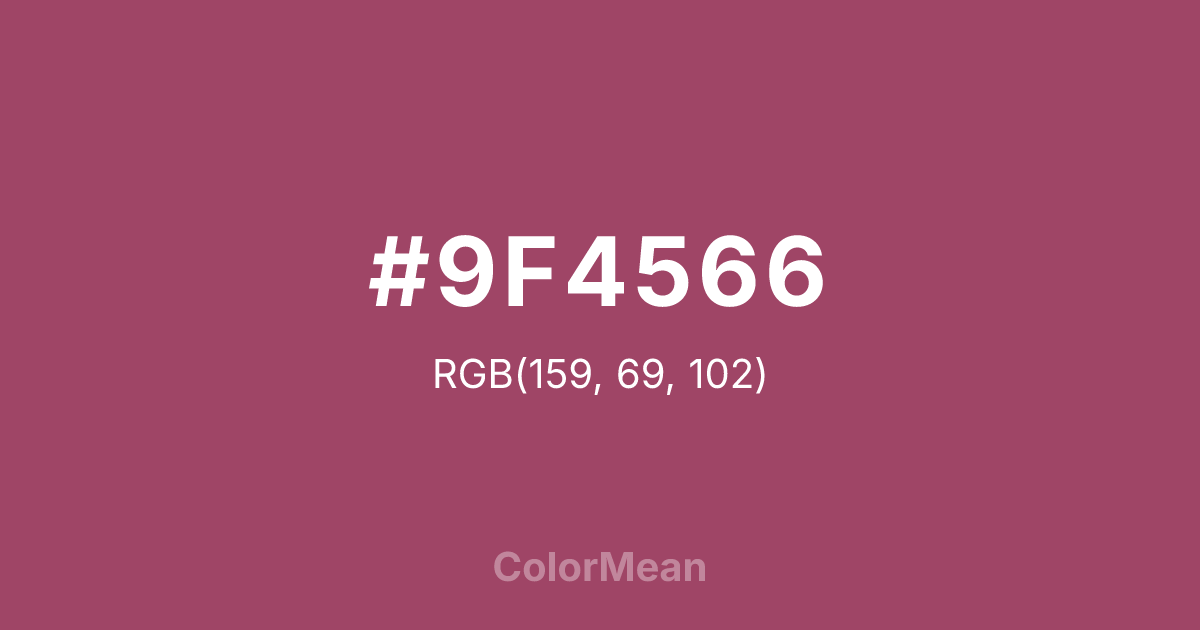 #9F4566 RGB value is (159, 69, 102). The hex color red value is 159, green is 69, and blue is 102. Its HSL format shows a hue of 338°, saturation of 39 percent, and lightness of 45 percent. The CMYK process values are 0 percent, 57 percent, 36 percent, 38 percent.