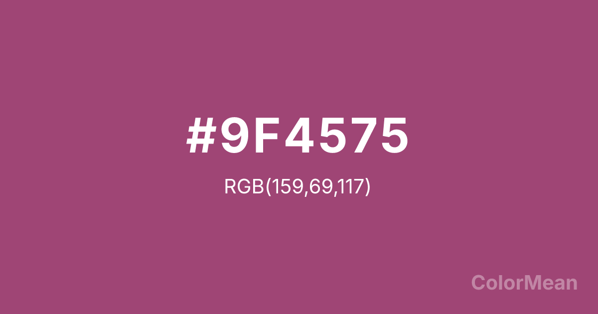 #9F4575 RGB value is (159, 69, 117). The hex color red value is 159, green is 69, and blue is 117. Its HSL format shows a hue of 328°, saturation of 39 percent, and lightness of 45 percent. The CMYK process values are 0 percent, 57 percent, 26 percent, 38 percent.