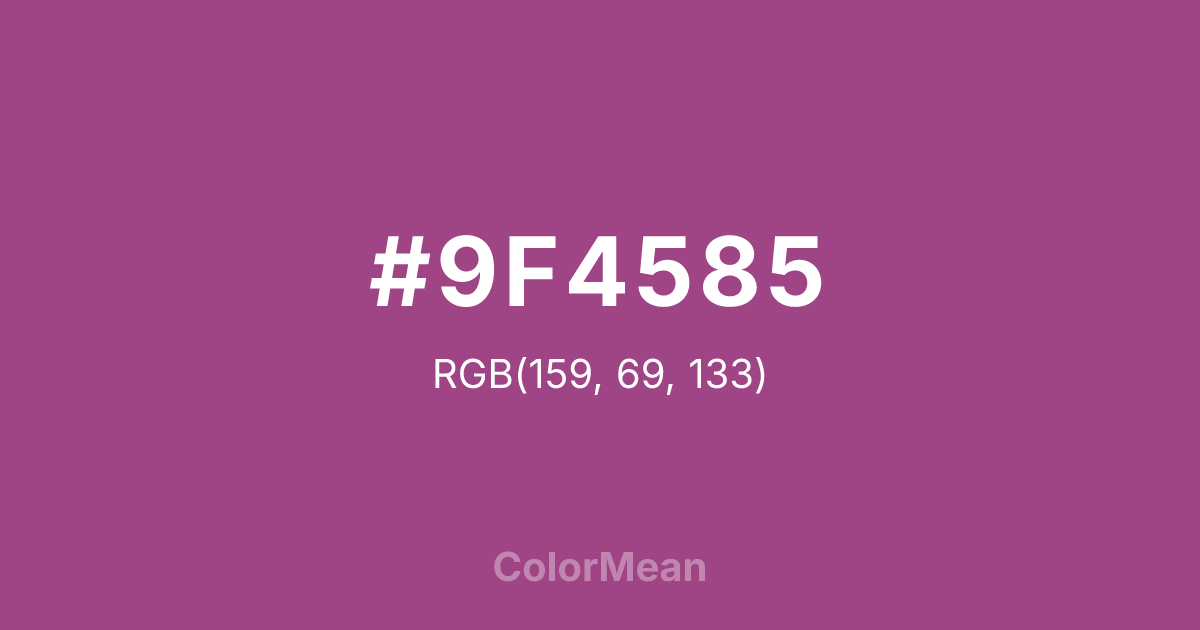 #9F4585 RGB value is (159, 69, 133). The hex color red value is 159, green is 69, and blue is 133. Its HSL format shows a hue of 317°, saturation of 39 percent, and lightness of 45 percent. The CMYK process values are 0 percent, 57 percent, 16 percent, 38 percent.