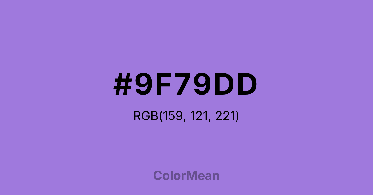 #9F79DD RGB value is (159, 121, 221). The hex color red value is 159, green is 121, and blue is 221. Its HSL format shows a hue of 263°, saturation of 60 percent, and lightness of 67 percent. The CMYK process values are 28 percent, 45 percent, 0 percent, 13 percent.