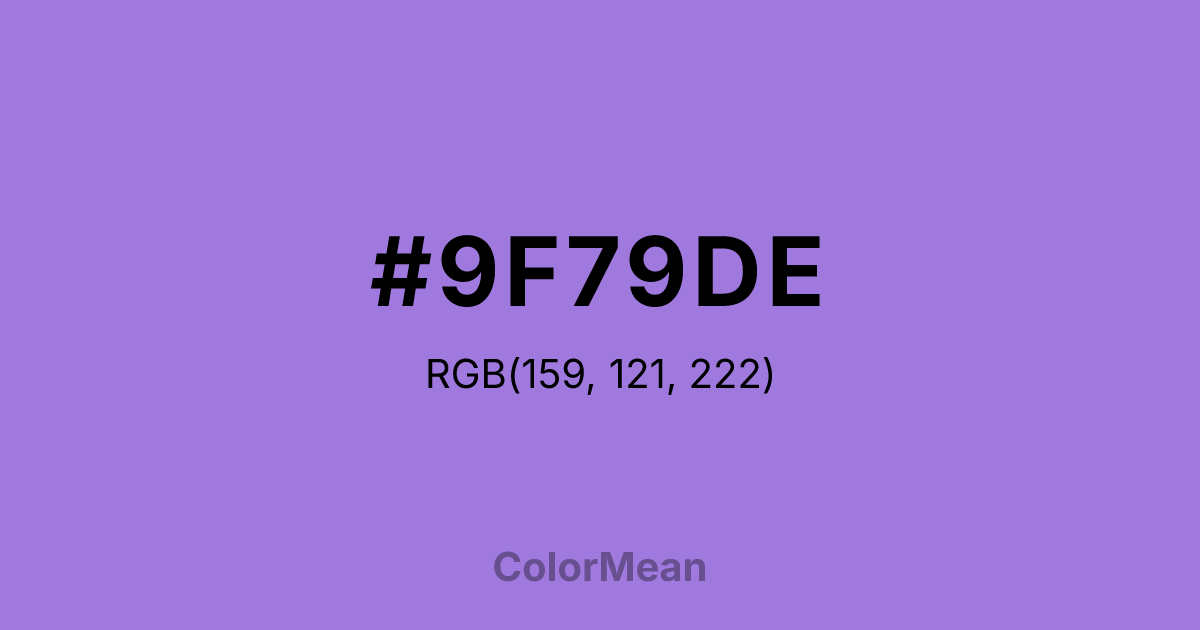 #9F79DE RGB value is (159, 121, 222). The hex color red value is 159, green is 121, and blue is 222. Its HSL format shows a hue of 263°, saturation of 60 percent, and lightness of 67 percent. The CMYK process values are 28 percent, 45 percent, 0 percent, 13 percent.