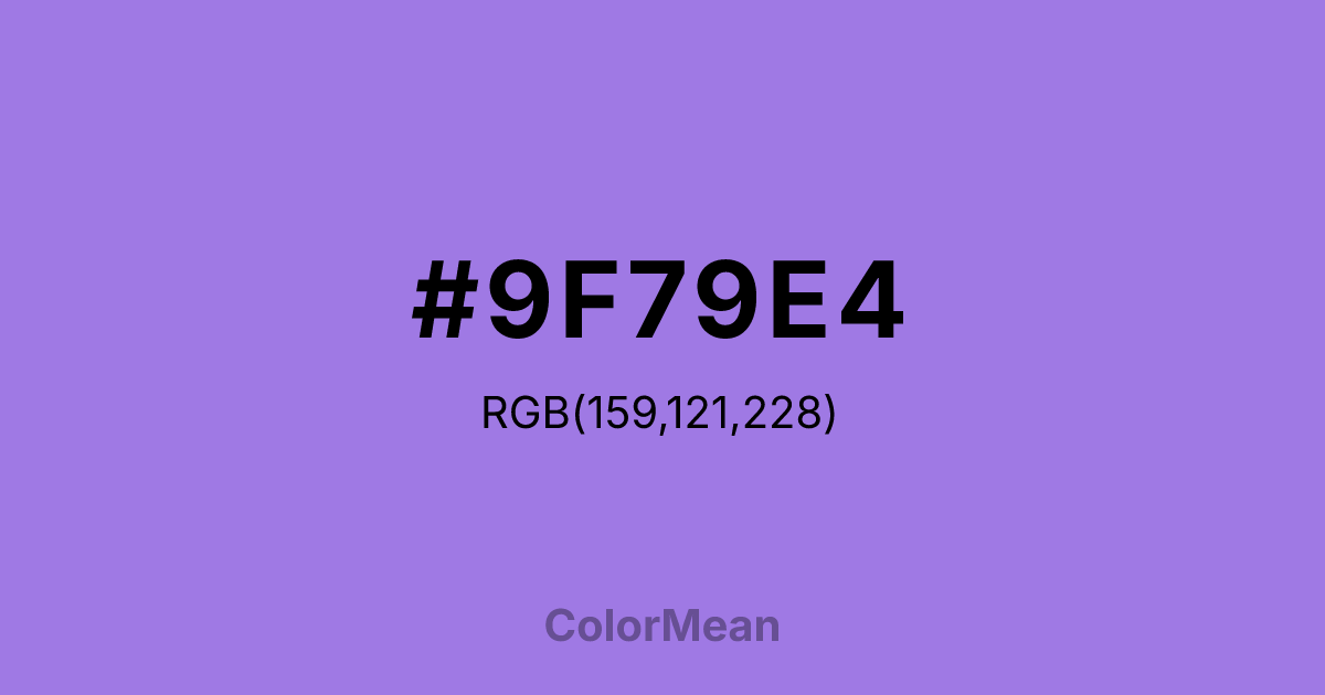 #9F79E4 RGB value is (159, 121, 228). The hex color red value is 159, green is 121, and blue is 228. Its HSL format shows a hue of 261°, saturation of 66 percent, and lightness of 68 percent. The CMYK process values are 30 percent, 47 percent, 0 percent, 11 percent.