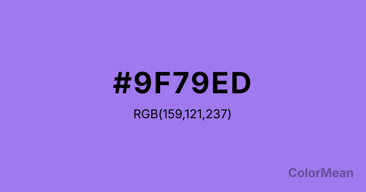 #9F79ED RGB value is (159, 121, 237). The hex color red value is 159, green is 121, and blue is 237. Its HSL format shows a hue of 260°, saturation of 76 percent, and lightness of 70 percent. The CMYK process values are 33 percent, 49 percent, 0 percent, 7 percent.