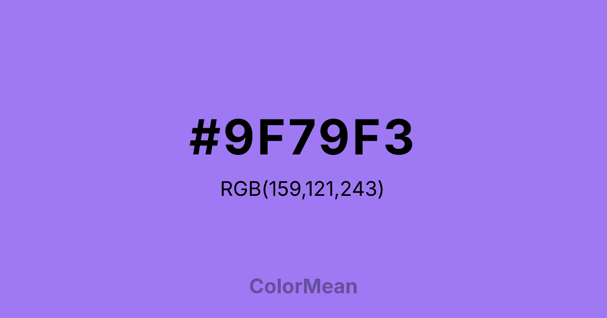 #9F79F3 RGB value is (159, 121, 243). The hex color red value is 159, green is 121, and blue is 243. Its HSL format shows a hue of 259°, saturation of 84 percent, and lightness of 71 percent. The CMYK process values are 35 percent, 50 percent, 0 percent, 5 percent.