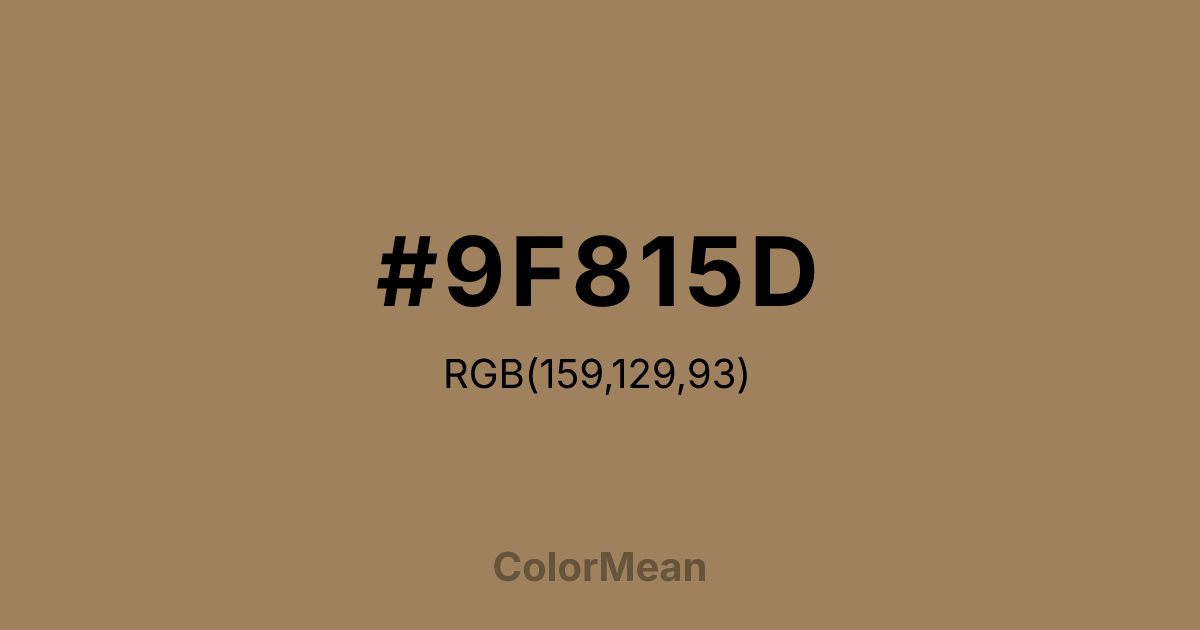 #9F815D RGB value is (159, 129, 93). The hex color red value is 159, green is 129, and blue is 93. Its HSL format shows a hue of 33°, saturation of 26 percent, and lightness of 49 percent. The CMYK process values are 0 percent, 19 percent, 42 percent, 38 percent.