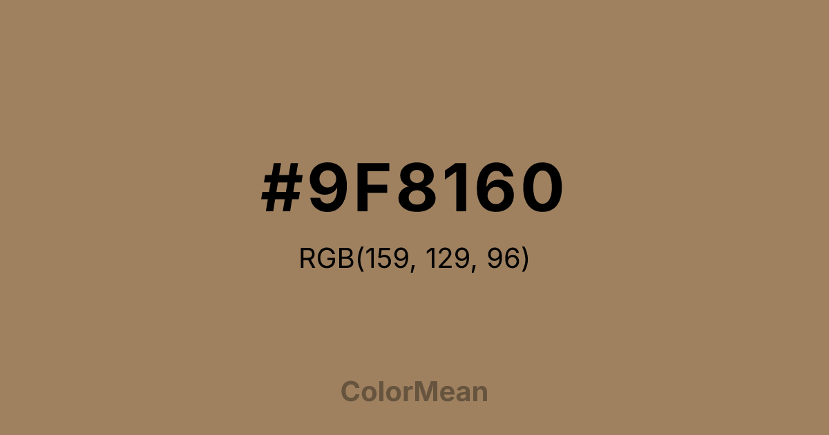 #9F8160 RGB value is (159, 129, 96). The hex color red value is 159, green is 129, and blue is 96. Its HSL format shows a hue of 31°, saturation of 25 percent, and lightness of 50 percent. The CMYK process values are 0 percent, 19 percent, 40 percent, 38 percent.