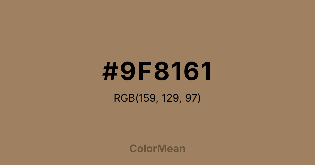 #9F8161 RGB value is (159, 129, 97). The hex color red value is 159, green is 129, and blue is 97. Its HSL format shows a hue of 31°, saturation of 24 percent, and lightness of 50 percent. The CMYK process values are 0 percent, 19 percent, 39 percent, 38 percent.