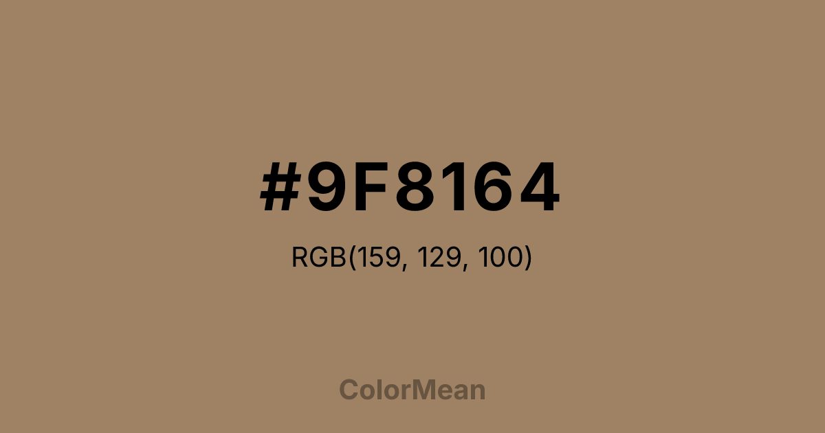 #9F8164 RGB value is (159, 129, 100). The hex color red value is 159, green is 129, and blue is 100. Its HSL format shows a hue of 29°, saturation of 24 percent, and lightness of 51 percent. The CMYK process values are 0 percent, 19 percent, 37 percent, 38 percent.