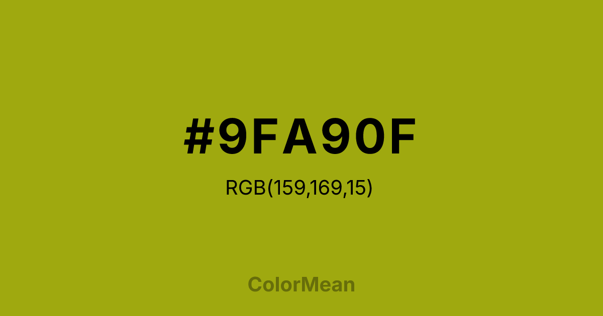 #9FA90F RGB value is (159, 169, 15). The hex color red value is 159, green is 169, and blue is 15. Its HSL format shows a hue of 64°, saturation of 84 percent, and lightness of 36 percent. The CMYK process values are 6 percent, 0 percent, 91 percent, 34 percent.
