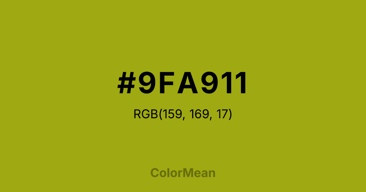 #9FA911 RGB value is (159, 169, 17). The hex color red value is 159, green is 169, and blue is 17. Its HSL format shows a hue of 64°, saturation of 82 percent, and lightness of 36 percent. The CMYK process values are 6 percent, 0 percent, 90 percent, 34 percent.